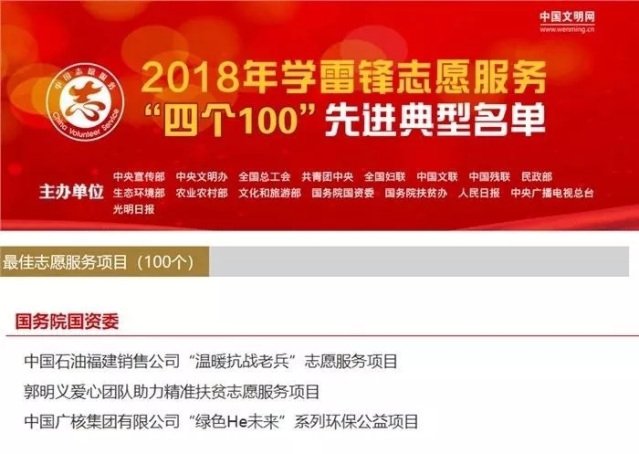 2月28日,中國文明網公布了2018年全國學雷鋒志愿服務“四個100”先進典型,由中廣核服務集團團委和中廣核工程有限公司團委聯合申報的“綠色He未來”系列環保公益項目榮獲全國2018年學雷鋒志愿服務“四個100”先進典型中的“最佳志愿服務項目”。