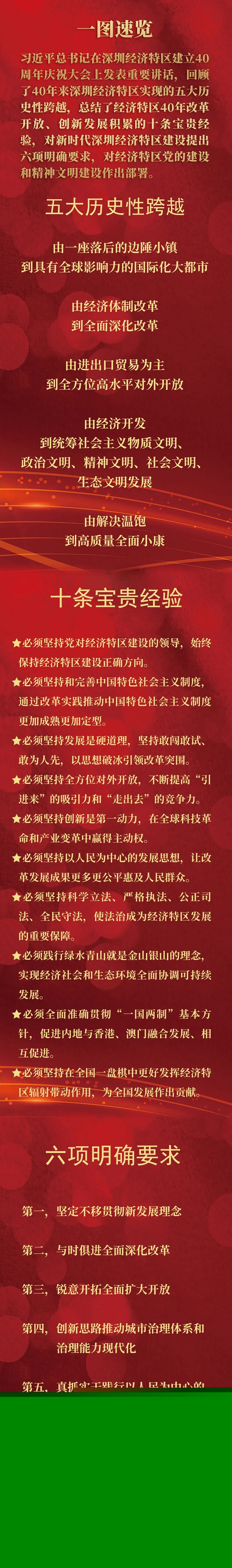 習(xí)近平總書記在深圳經(jīng)濟(jì)特區(qū)建立40周年慶祝大會(huì)上發(fā)表重要講話,回顧了40年來(lái)深圳經(jīng)濟(jì)特區(qū)實(shí)現(xiàn)的五大歷史性跨越,總結(jié)了經(jīng)濟(jì)特區(qū)40年改革開放、創(chuàng)新發(fā)展積累的十條寶貴經(jīng)驗(yàn),對(duì)新時(shí)代深圳經(jīng)濟(jì)特區(qū)建設(shè)提出六項(xiàng)明確要求,對(duì)經(jīng)濟(jì)特區(qū)黨的建設(shè)和精神文明建設(shè)作出部署。
