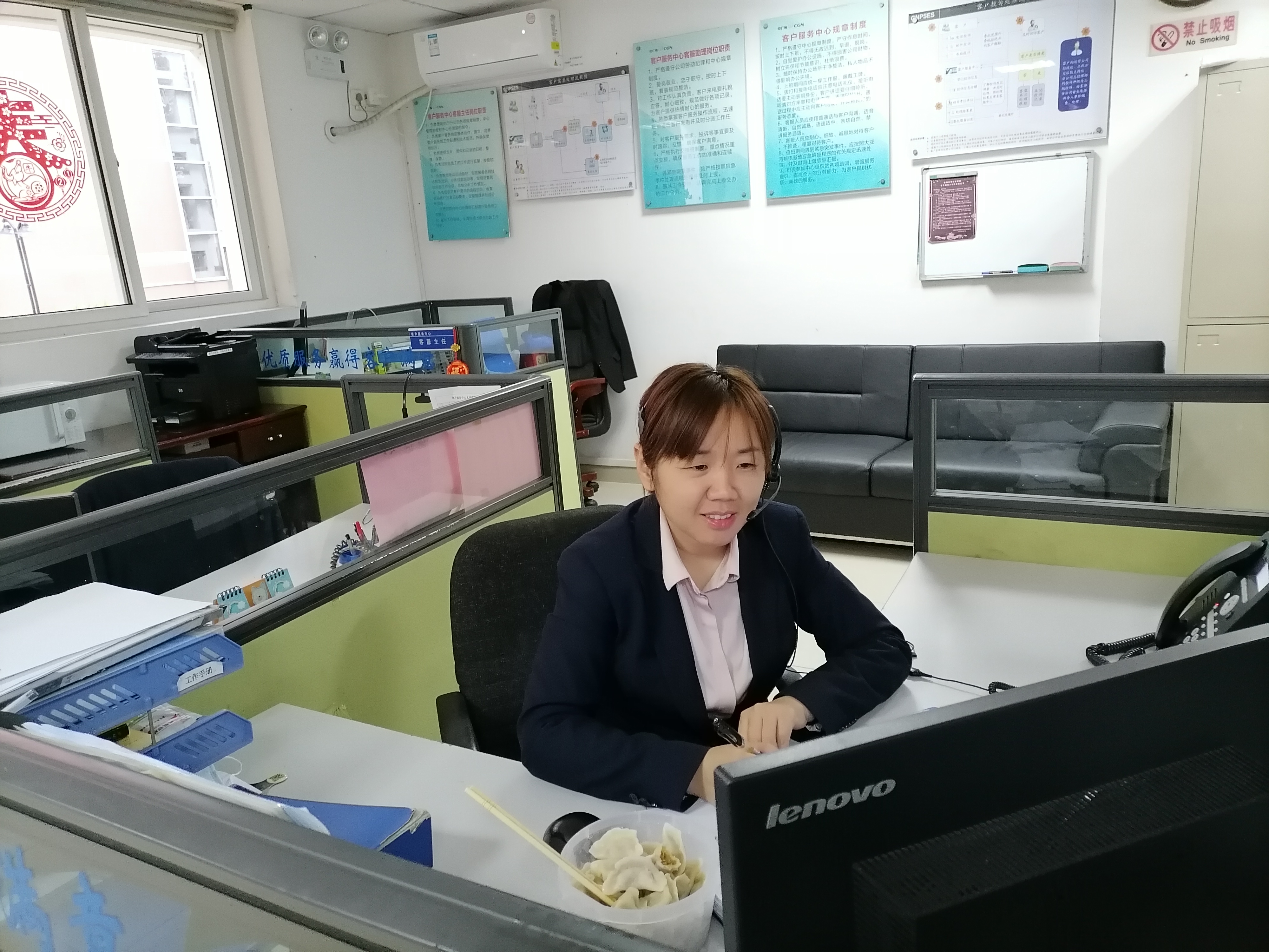 她一邊工作一邊在卡座上吃餃子。